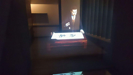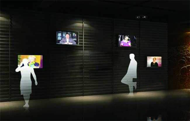 觀眾看到墻面上多個(gè)顯示設(shè)備中,每個(gè)顯示畫(huà)面中都有人物的視頻靜止影像。每臺(tái)電視下都有一個(gè)控制按鈕(可以是自動(dòng)感應(yīng)器),當(dāng)觀眾按到其中一個(gè)時(shí)(當(dāng)自動(dòng)感應(yīng)器撲捉有人接近 ……